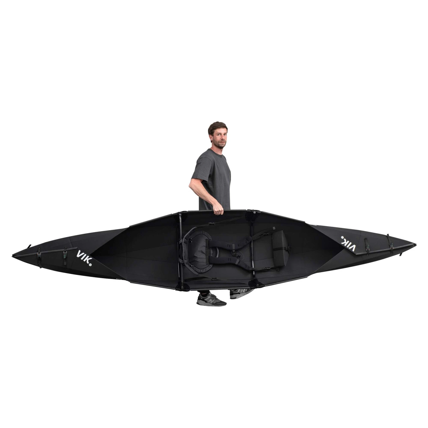 Dieses Kajak passt selbst in eine 1-Zimmer-Wohnung oder flach unter das Bett deines Vans! Das elegante, schwarze Reiseboot lässt sich auf ein Packmaß von 70 x 55 x 16 cm falten und kompakt lagern.